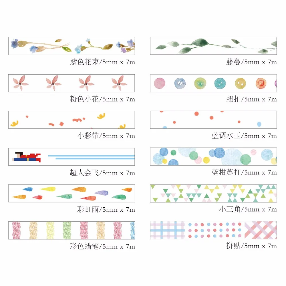 This decorative tape comes in various sizes and thousands upon thousands of different prints. There are check boxes, days of the week, holidays, animations, cutesy things, and so many other things that are printed on these tapes. There are cloth varieties and some that are more of a slick surfaced tape. They can be written on (usually with a Sharpie marker).